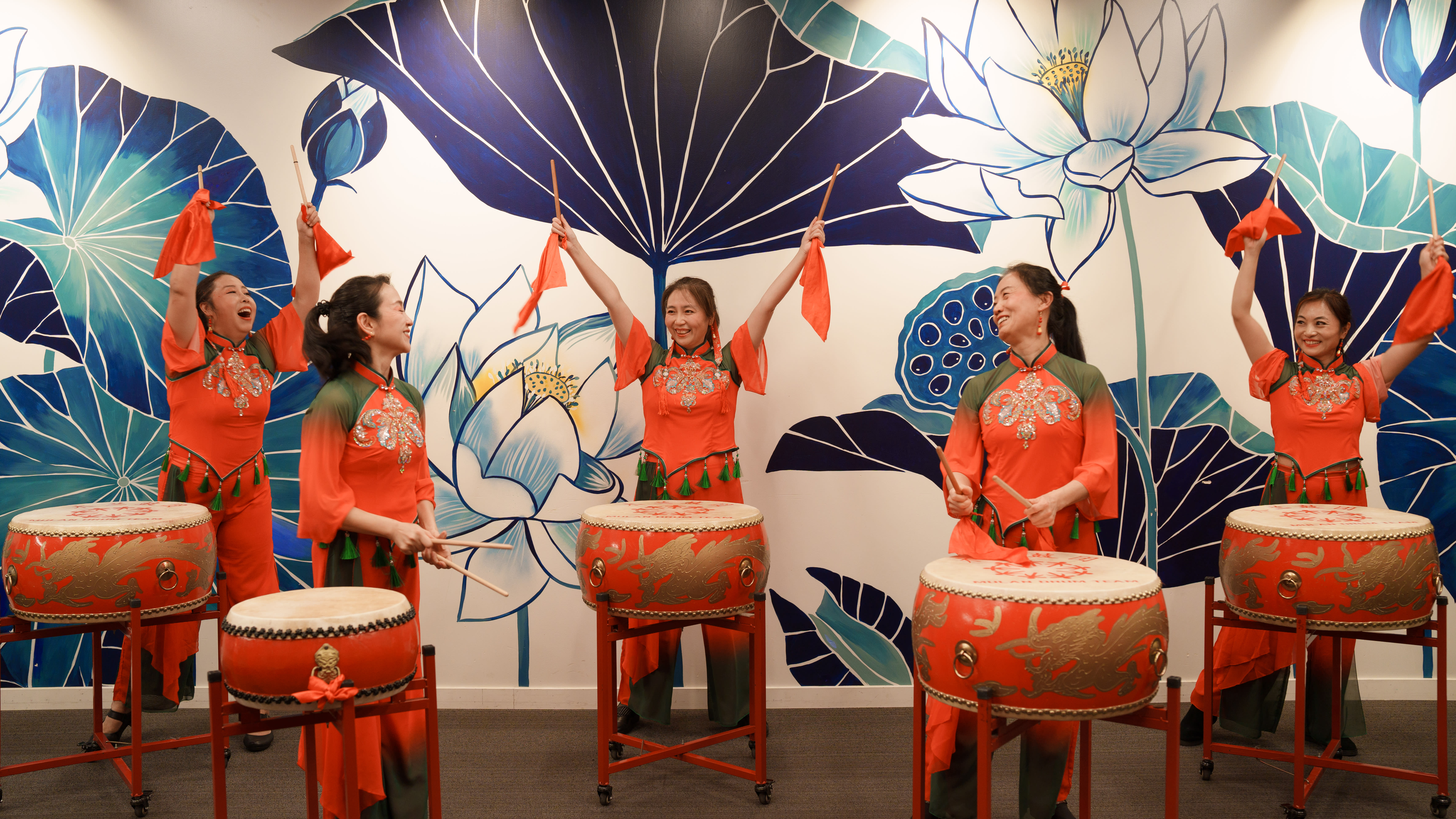 Since its establishment, the team has actively performed in various community events, including art festivals, nursing homes, schools, and other venues. The sound of their drums is entrancing, powerful, and impactful, echoing the beauty and strength of Chinese women and contributing to the celebration of Chinese culture in our community.