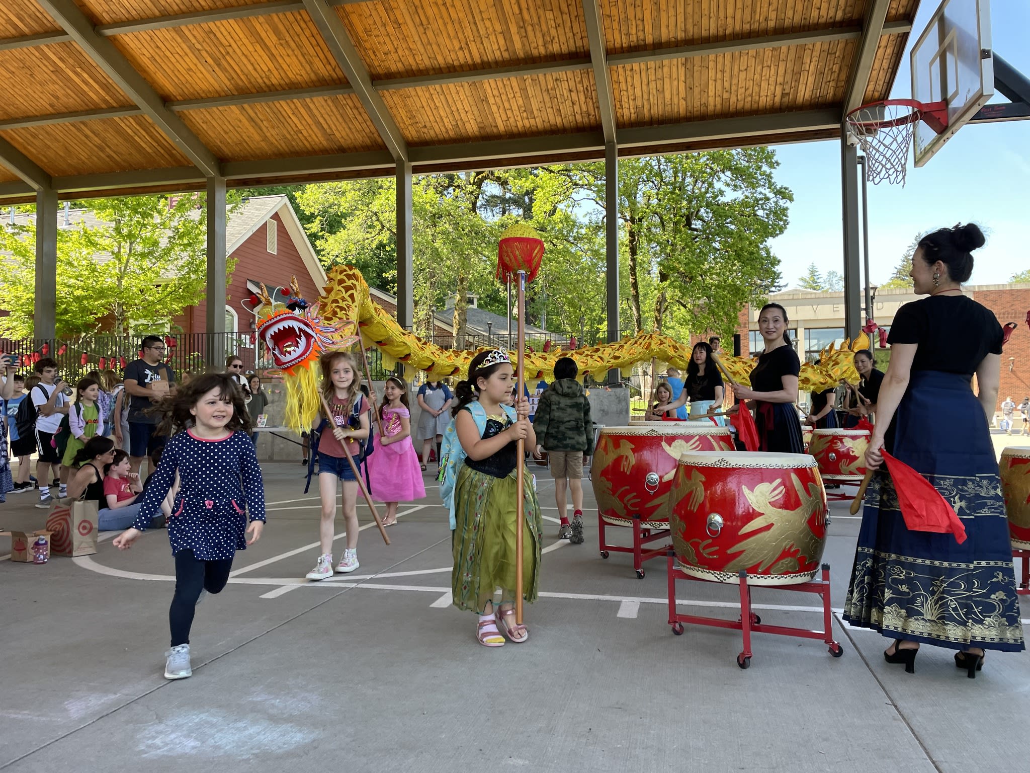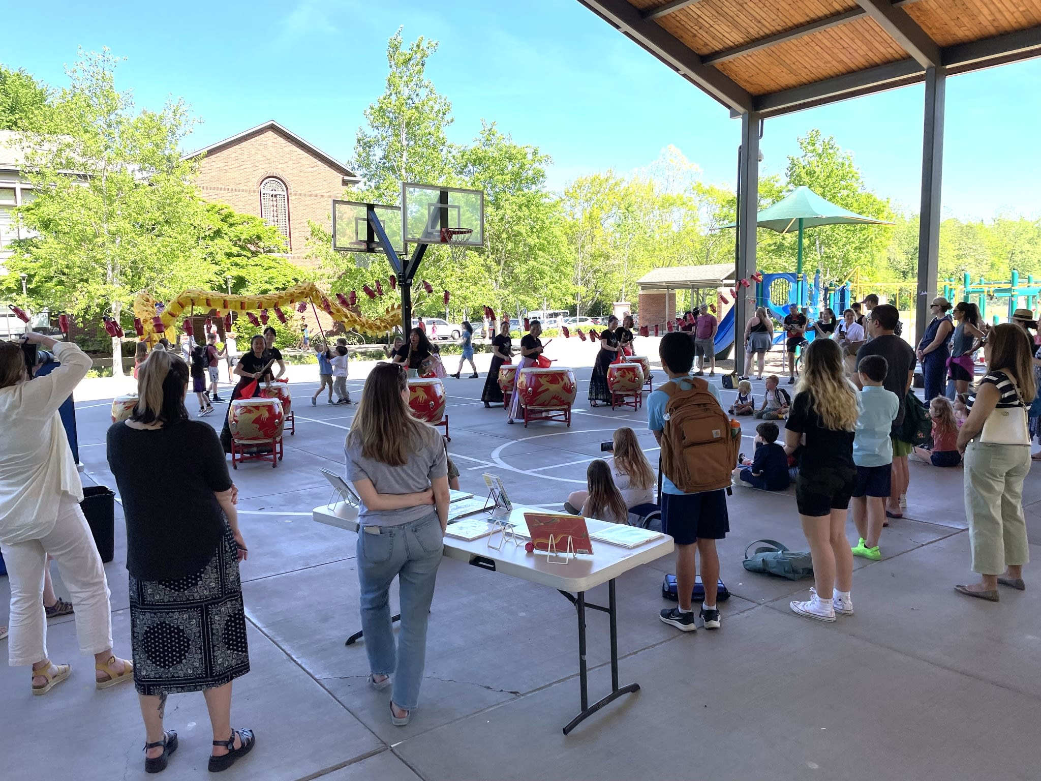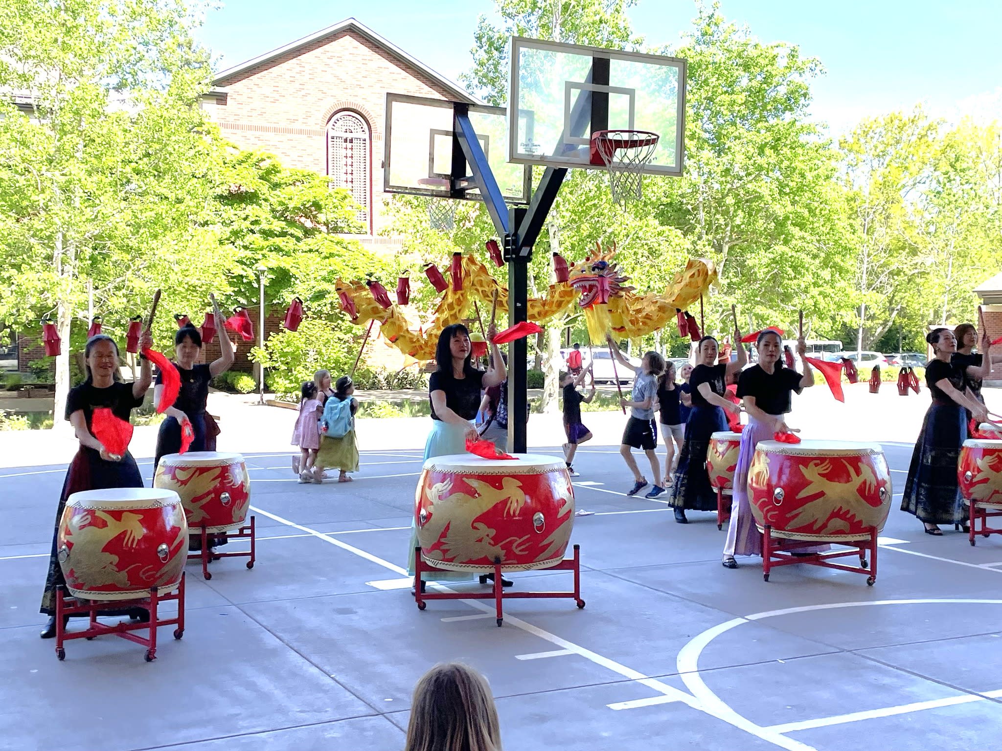 今天,OCC的木兰鼓队和翡翠舞队参加了Riverdale校区举办的AAPI活动。我们是全场唯一文化表演团体。开始时,学生们和鼓队员们的互动非常感人,学生们对舞龙充满了好奇。原计划的狮子舞因故未到,等到舞队上场时,许多学生已经跟着家长回家了。即便如此,我们的舞队队员们仍然非常认真地完成了两支舞蹈,甚至在水泥地上也毫不犹豫地做出劈叉动作。我们为她们感到骄傲!