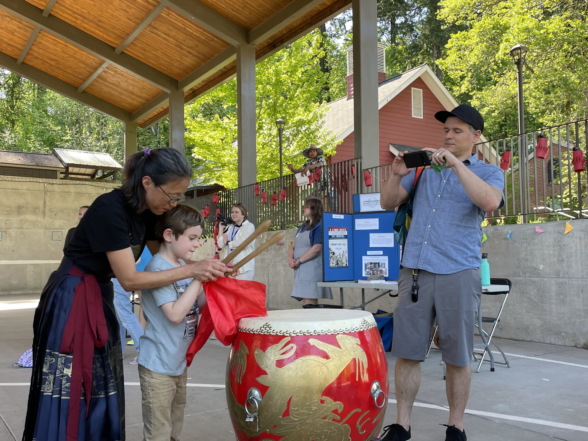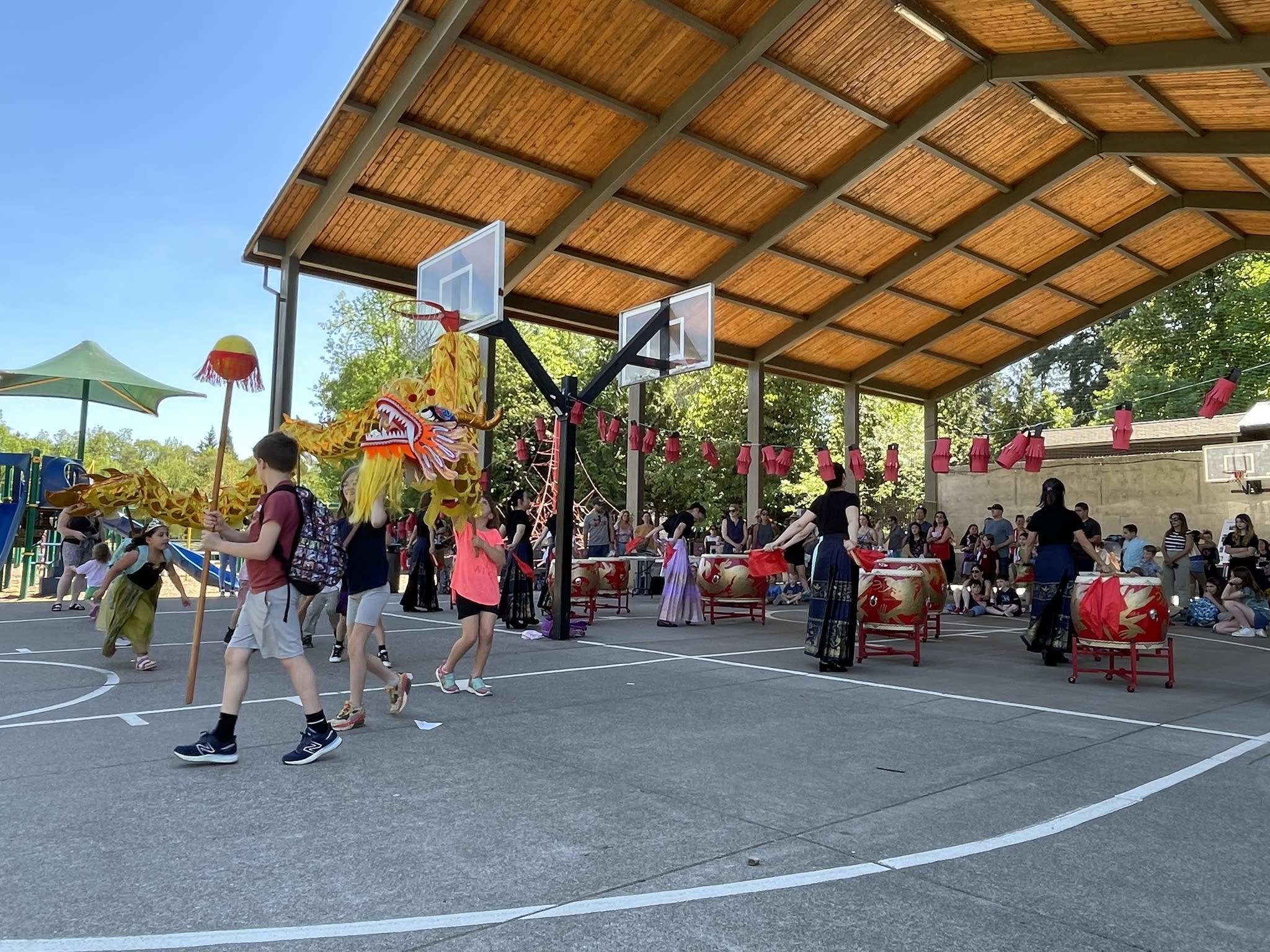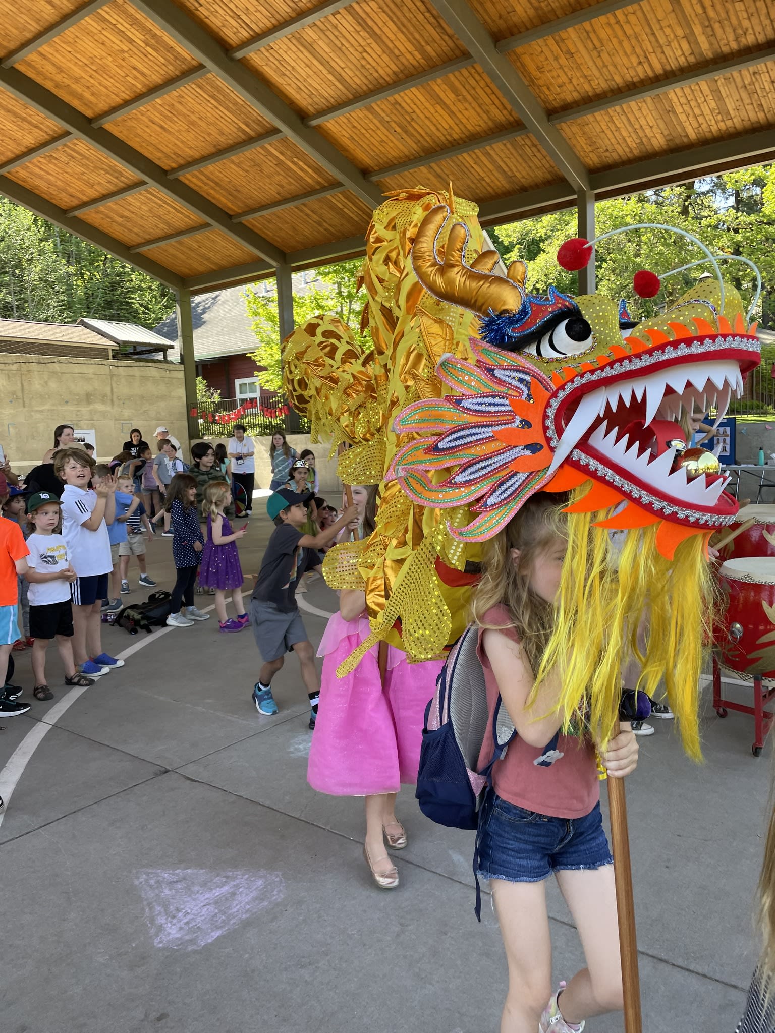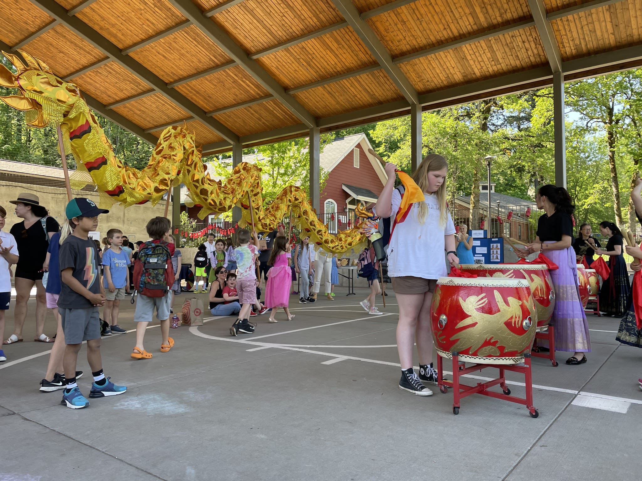 今天,OCC的木兰鼓队和翡翠舞队参加了Riverdale校区举办的AAPI活动。我们是全场唯一文化表演团体。开始时,学生们和鼓队员们的互动非常感人,学生们对舞龙充满了好奇。原计划的狮子舞因故未到,等到舞队上场时,许多学生已经跟着家长回家了。即便如此,我们的舞队队员们仍然非常认真地完成了两支舞蹈,甚至在水泥地上也毫不犹豫地做出劈叉动作。我们为她们感到骄傲!