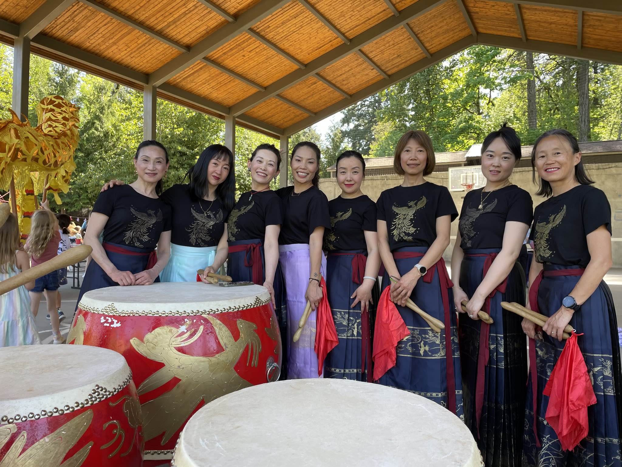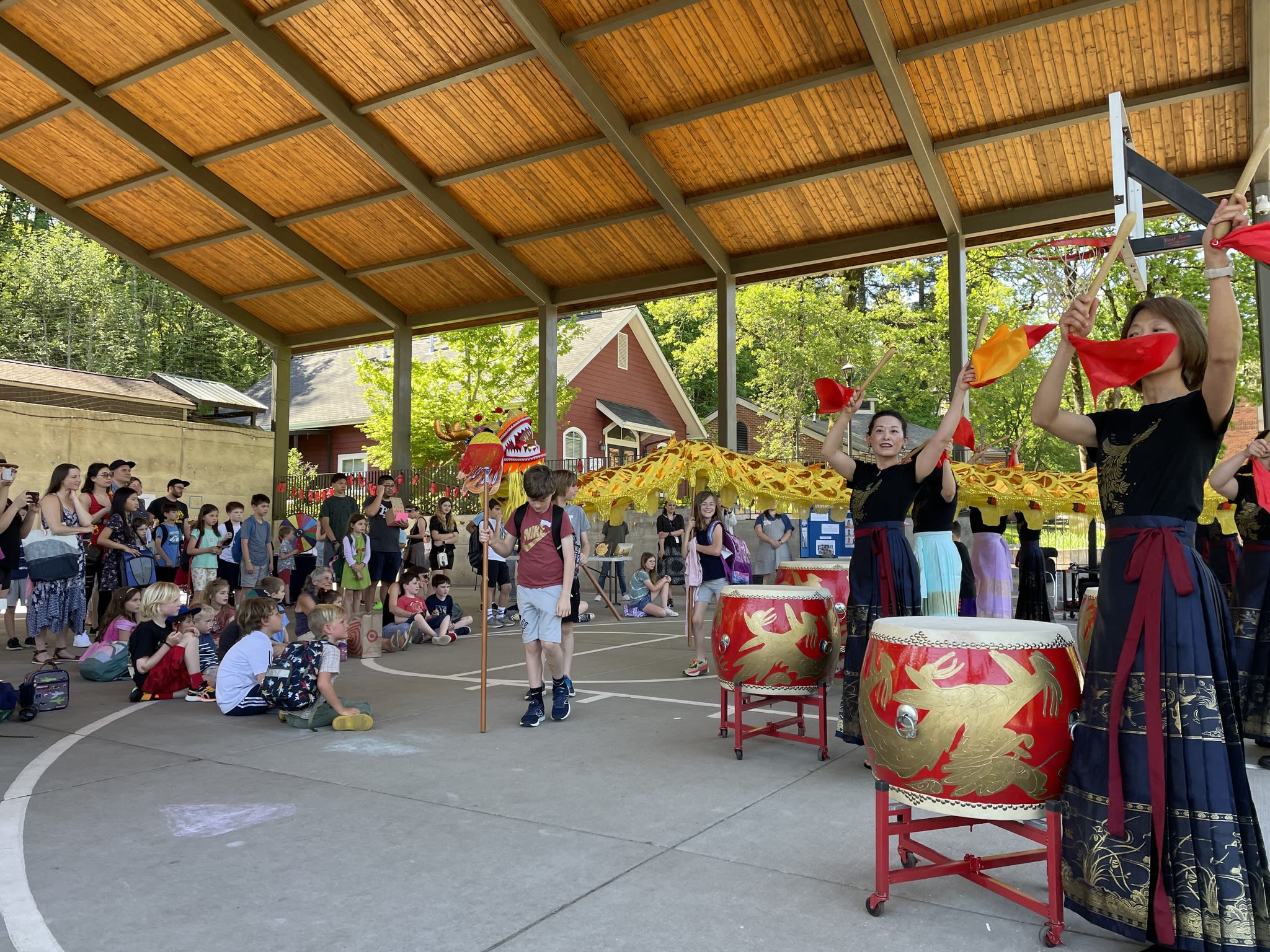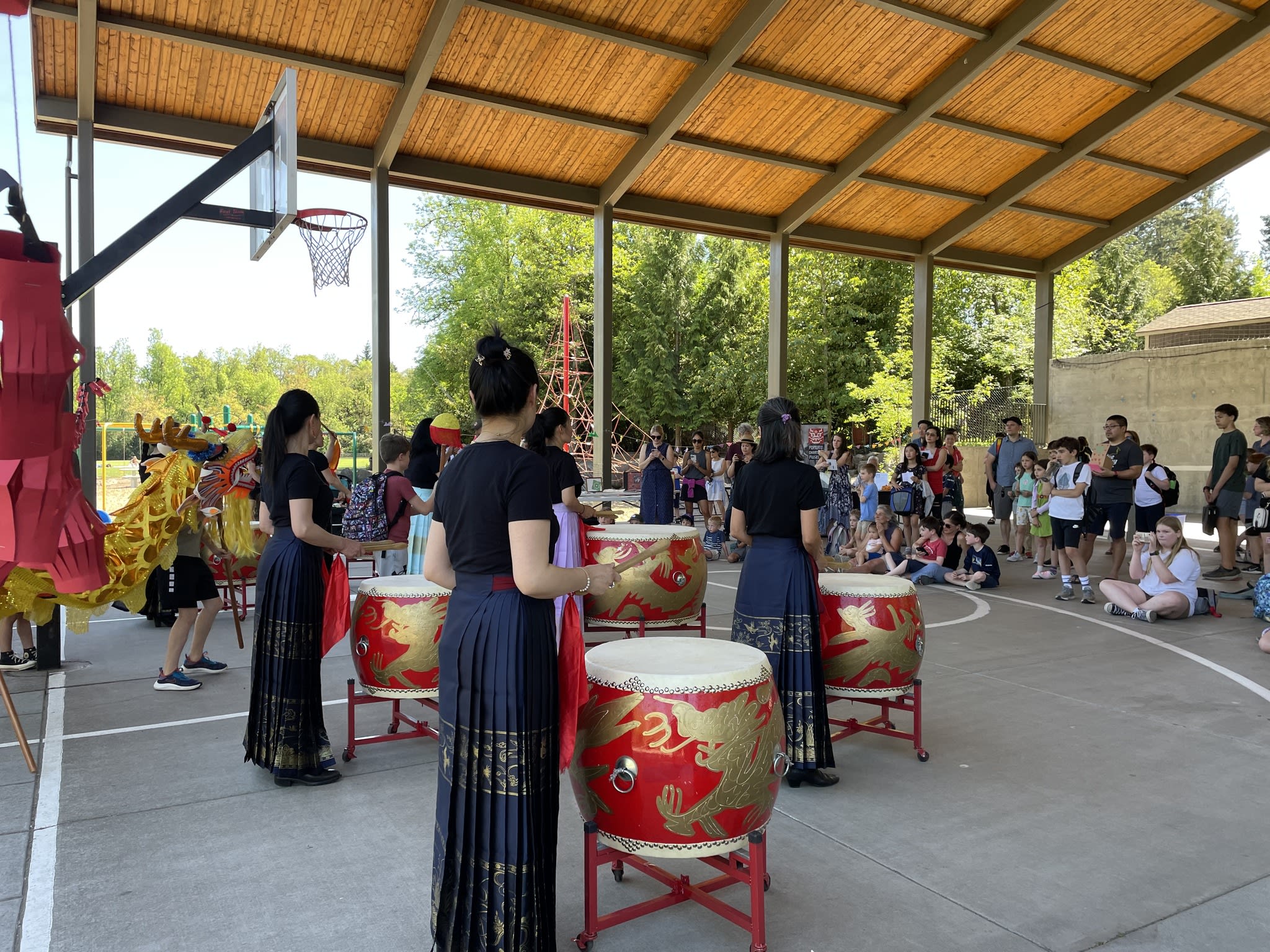 Our Mulan Drum Team and Jade Dance Team participated in the first AAPI event at Riverdale Grade School, which was organized by the Riverdale School District. We had a fantastic time and enjoyed spending time with the kids who had just completed the school day. Later, despite the small audience, our dance team students performed with the same level of quality and professionalism as they would on a larger stage. The audience were impressed to see the dancers perform their splits on the concrete floor, without any hesitation. Hats off to them!