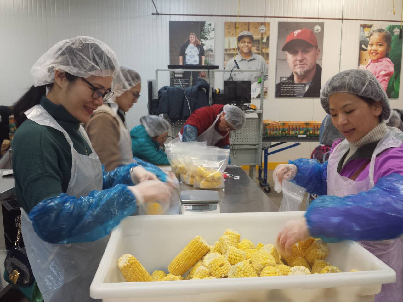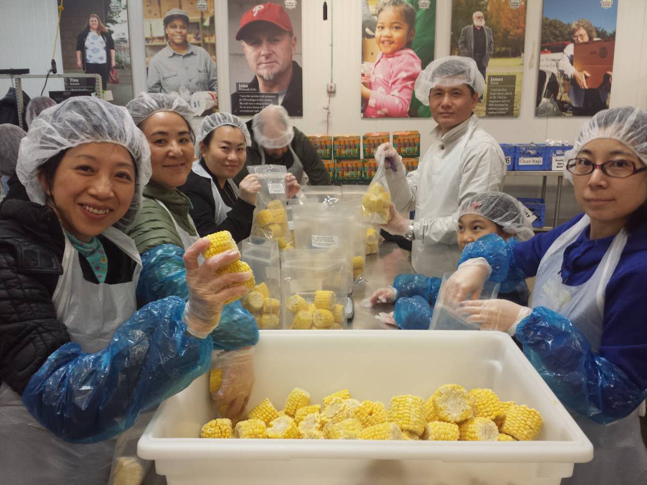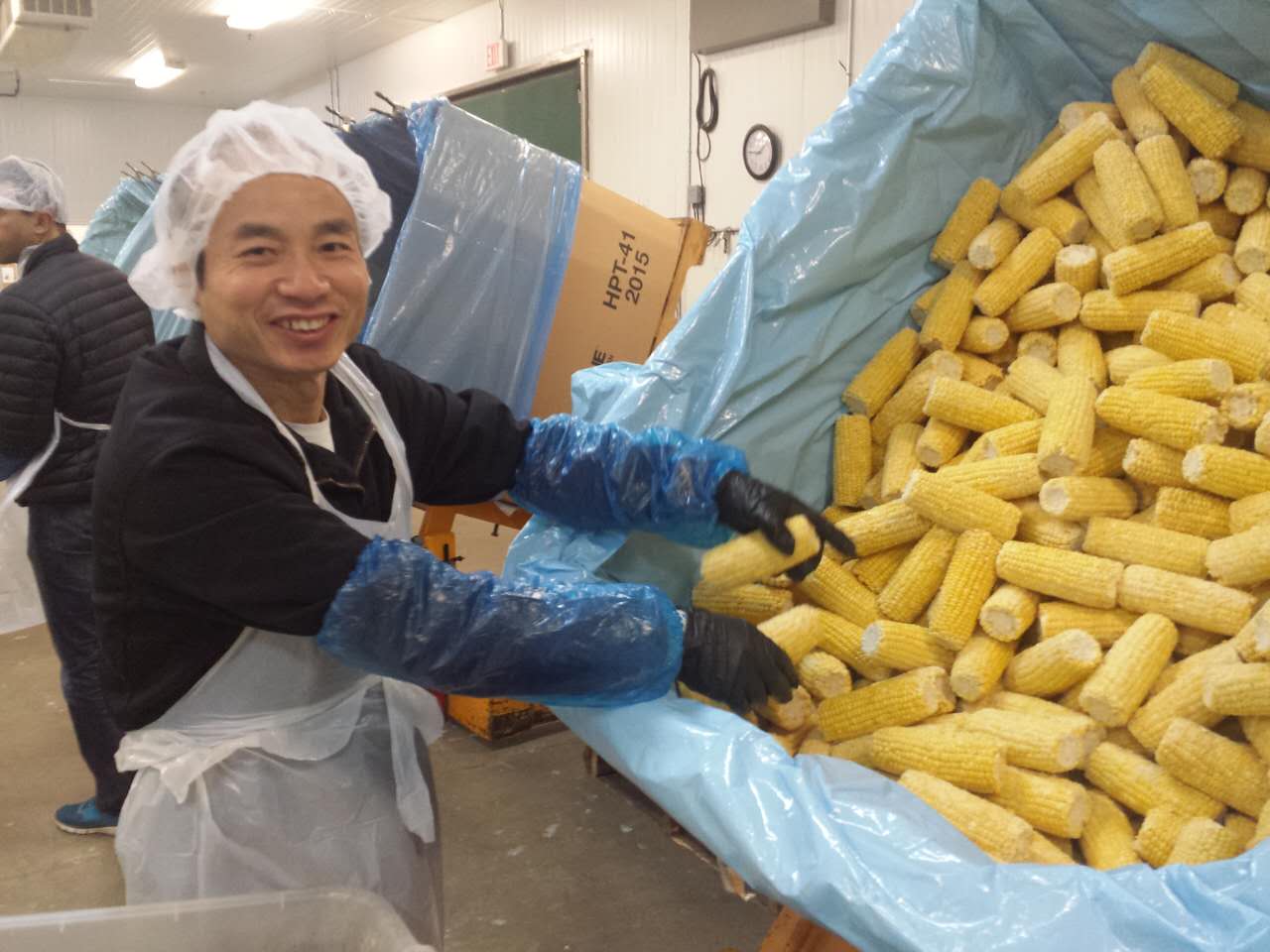 和我一起从大包装装进大塑料盒子然后分给工作台的一位老美,希望以此省了今天的一趟Gym,没想到我的装盒子速度让他不得不举着装满玉米的盒子来回走来走去。估计下次分工做这件事的就不会再需要4个义工了。