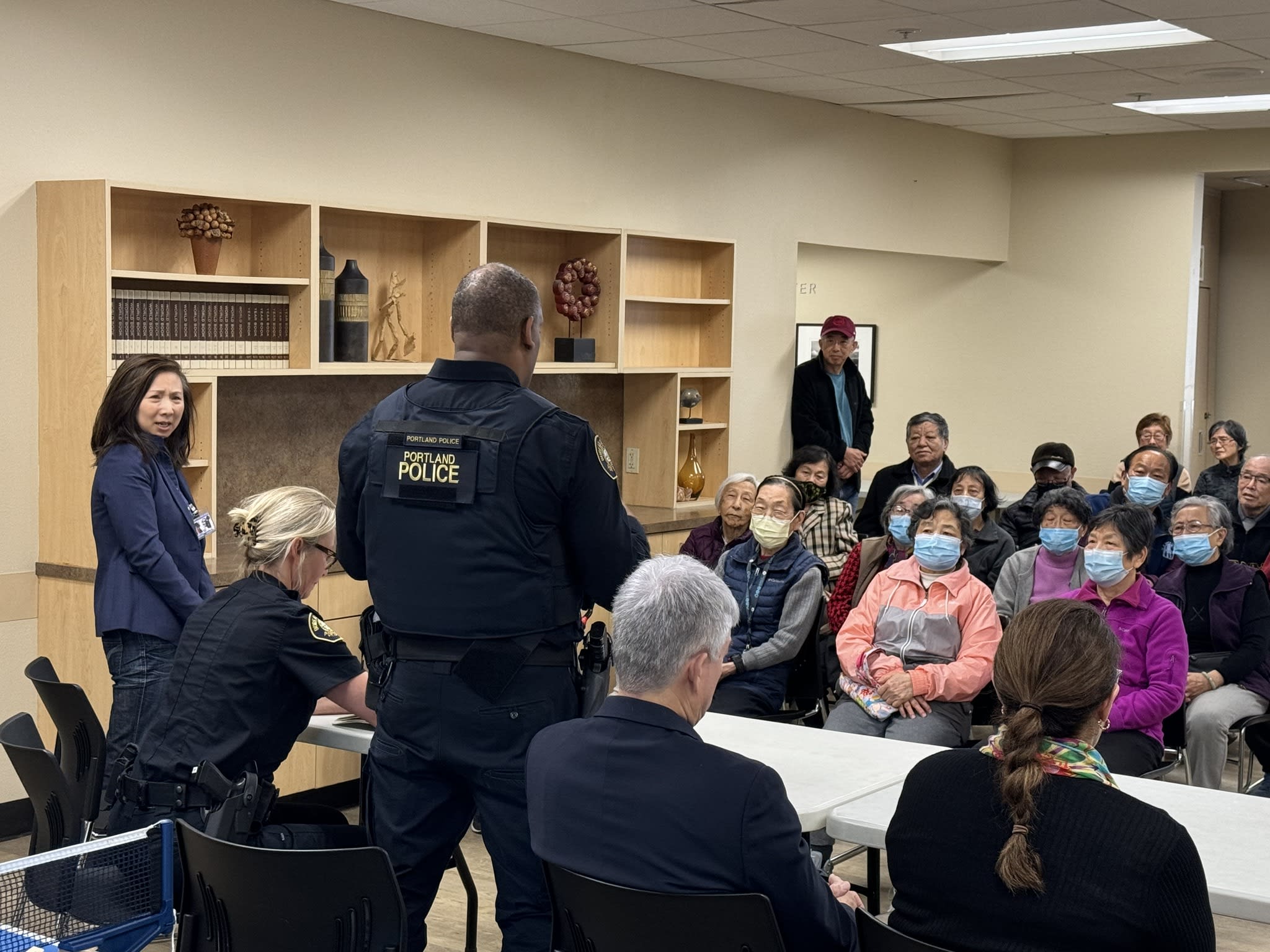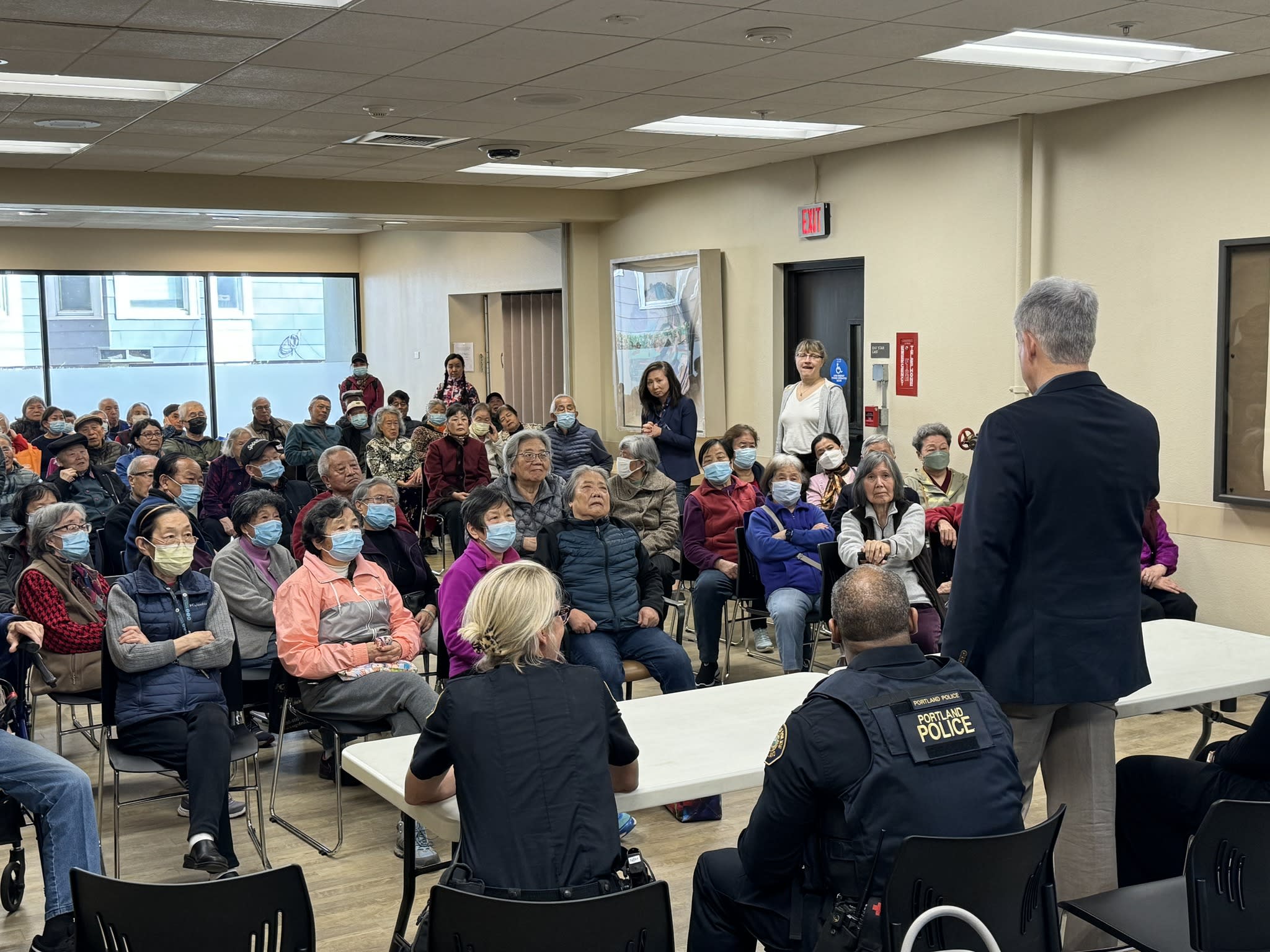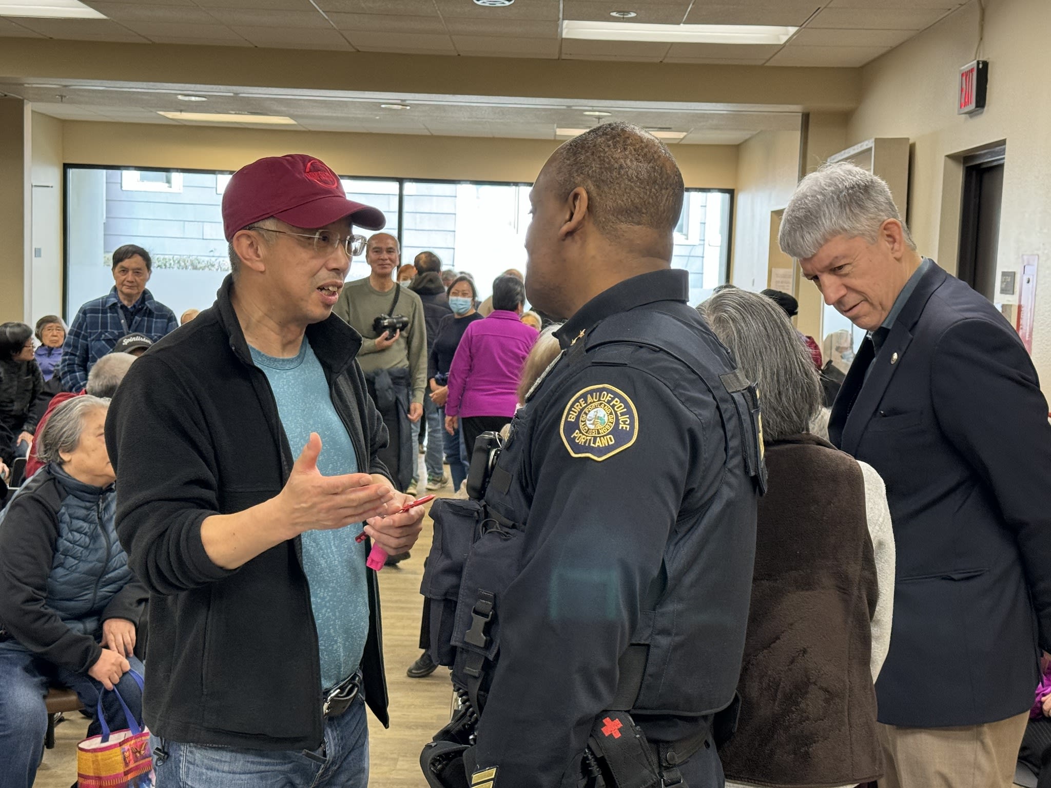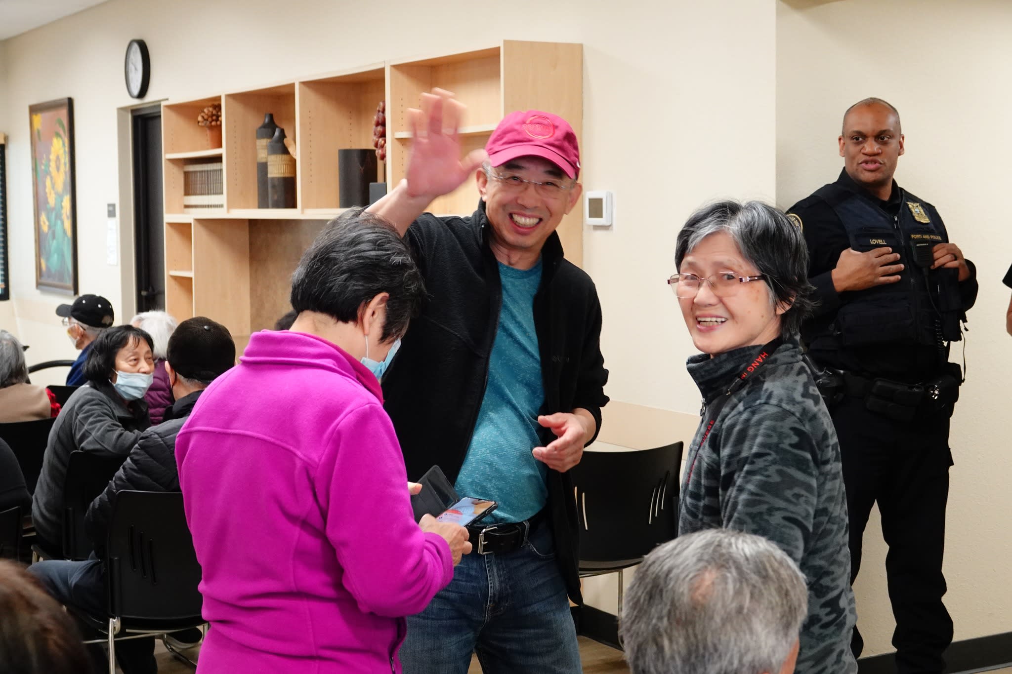 今天上午,波特兰警局的高级官员如期前往市中心的12街,拜访了华裔长者并举行了座谈会。这个想法是在看望梁先生之后由警局提出的,但他们没有预料到大家的参与热情如此高涨。不仅有六七十位老人出席,而且大家都积极参与了讨论。令人钦佩的是,尽管话题棘手,老人们讲话时仍然保持了风度。他们的发言逻辑清晰,并不完全是为了自己甚至是为了华人社区考虑。警局官员对老人们的理性表现给予了热情的回应,表示愿意与市中心分局讨论加强老人公寓周边和去Safeway购物途中的警力。