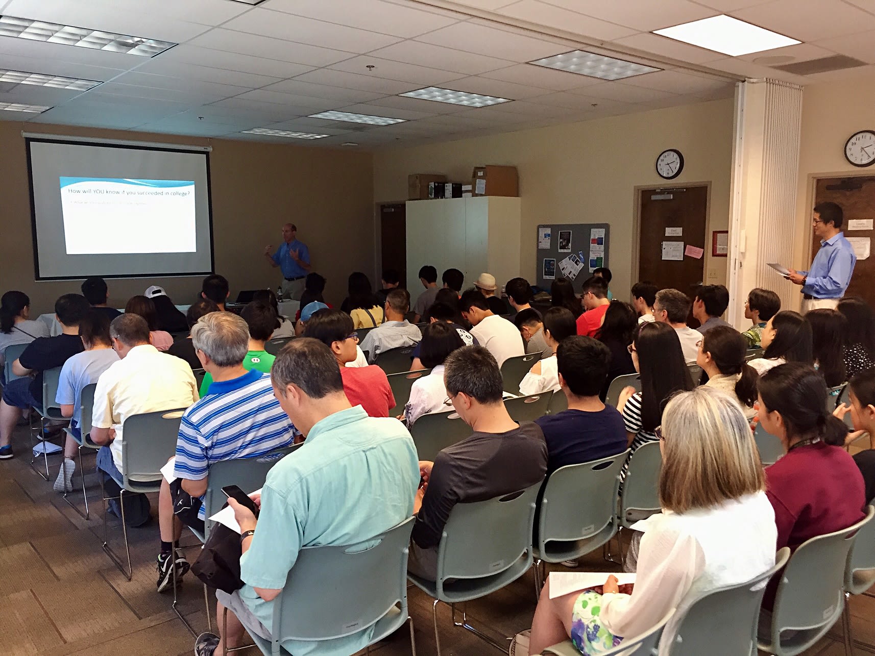 昨天的讲座系列的头炮,由UO的Mitchell主讲的Making a Successful Transition to College-Level Academics,真的是一炮打响!非常令人欣慰的是,Mitchell教授选择了我们社区的青少年作为他这个讲座题材的首批听众,当然这是我们的金曲生教授的功劳。也让我们组织者感到喜出望外的是,几乎所有的报名的学生和家长如数出席,整个会场座无虚席,讲者兴奋,听者认真,台上台下互动热烈。