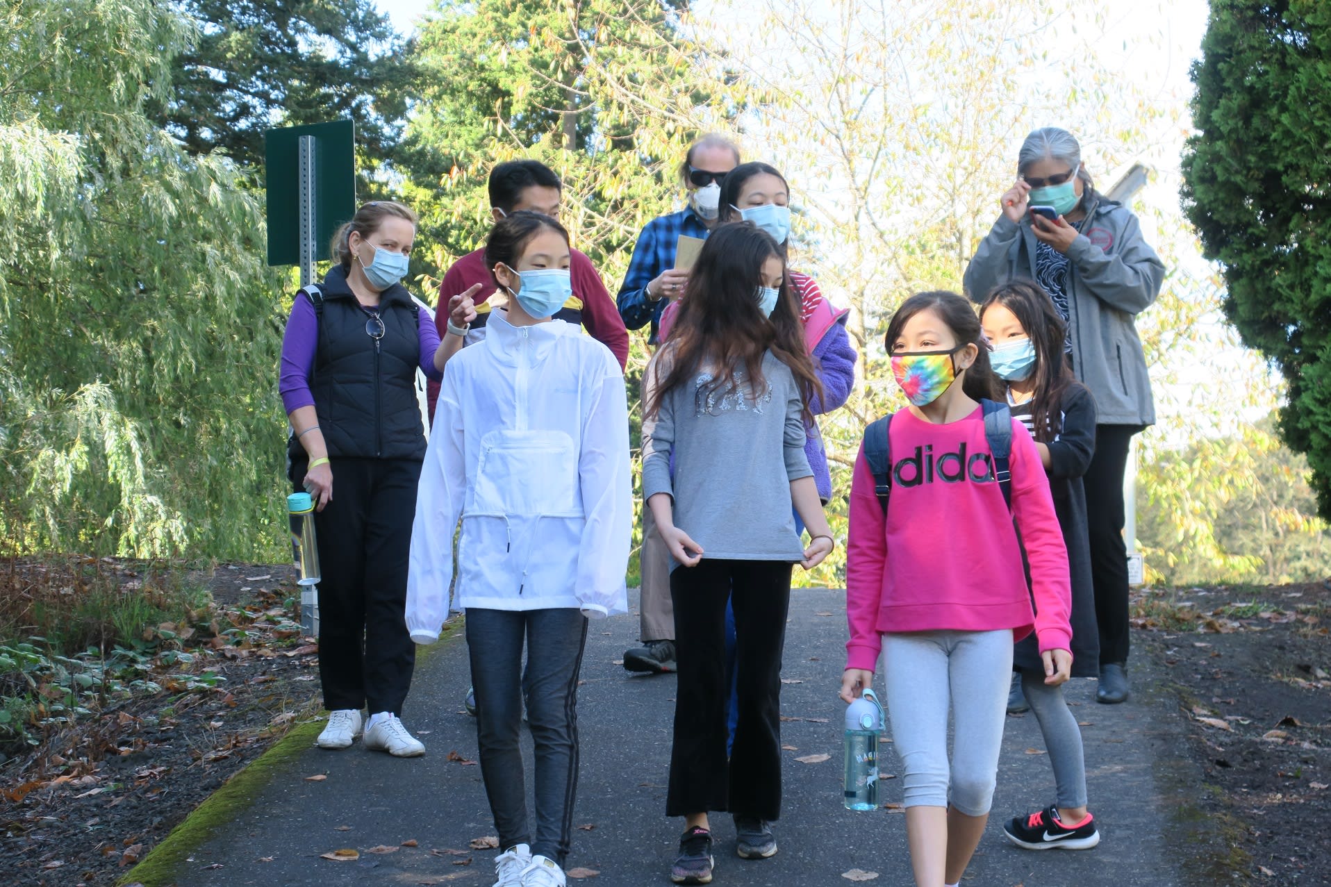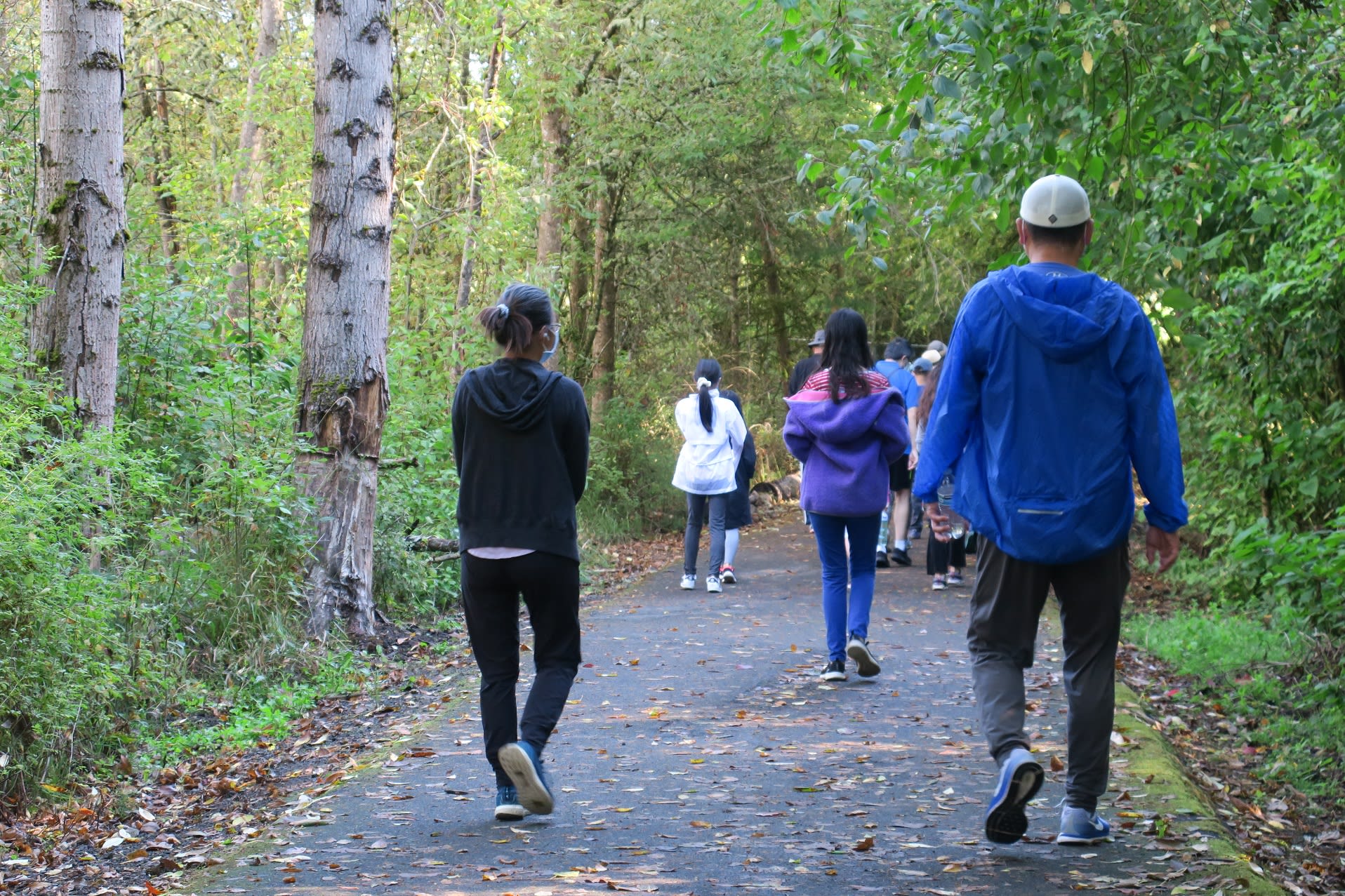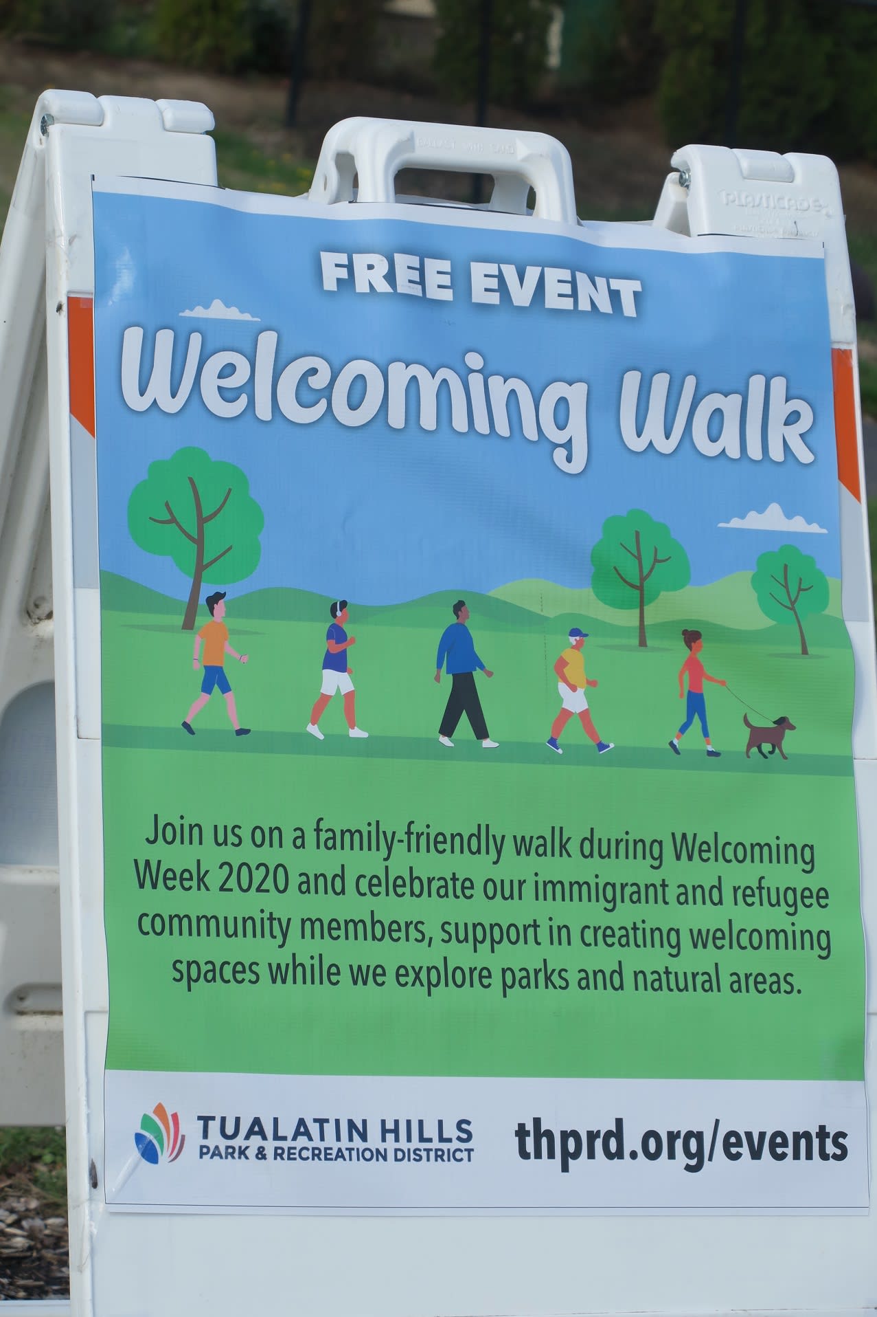 一条极具Oregon特色的小路迎来了社区的一群人,他们是参加THPRD组织的Welcoming Walk。这是一个全国性的活动,却是我们社区第一次参加。这让我想起刚去一个陌生的地方,当地人热情相邀,但你却婉拒了人家的好意,想想看以后这关系处起来是不是就会比较吃力,路上打招呼也会不那么的自然。如果是欣然接受,欢声笑语一番,彼此还是彼此,但是人家不会再当你为陌生人,自己也很快有了归属感。实际上,生活中是如此,移民到一个新的国度也是同样的道理。THPRD的这个活动就是给了我们这么一个印象,走了一小段路,彼此似乎成了至交,今天THPRD主动提供2500美元,邀请我们未来半年内在他们管辖内的任何一个地方举办活动。这不就是所谓的“你敬我一尺,我敬你一丈”吗。
