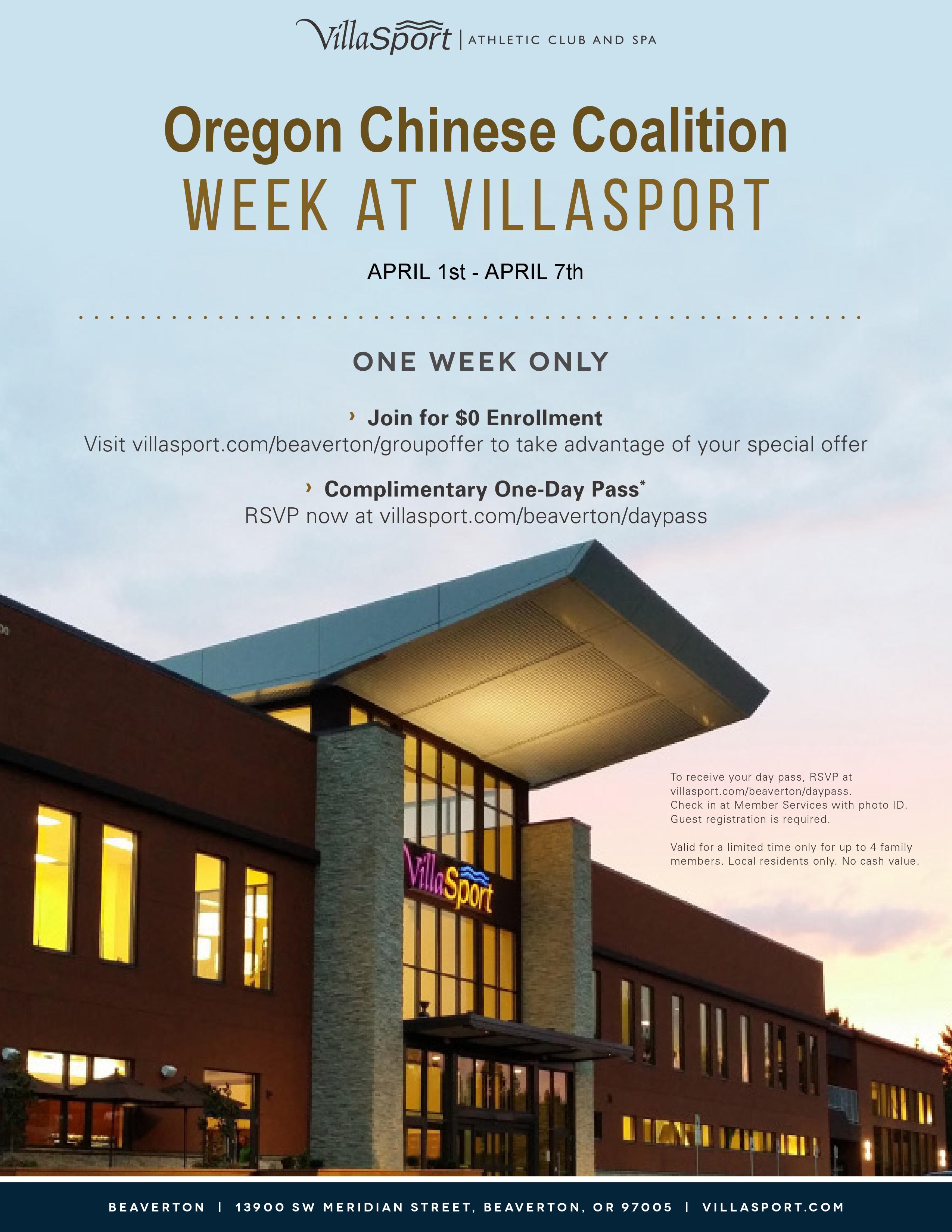 Save the Dates! Monday, April 1st to Sunday, April 7th will be “Oregon Chinese Coalition’s Week at VillaSport.”