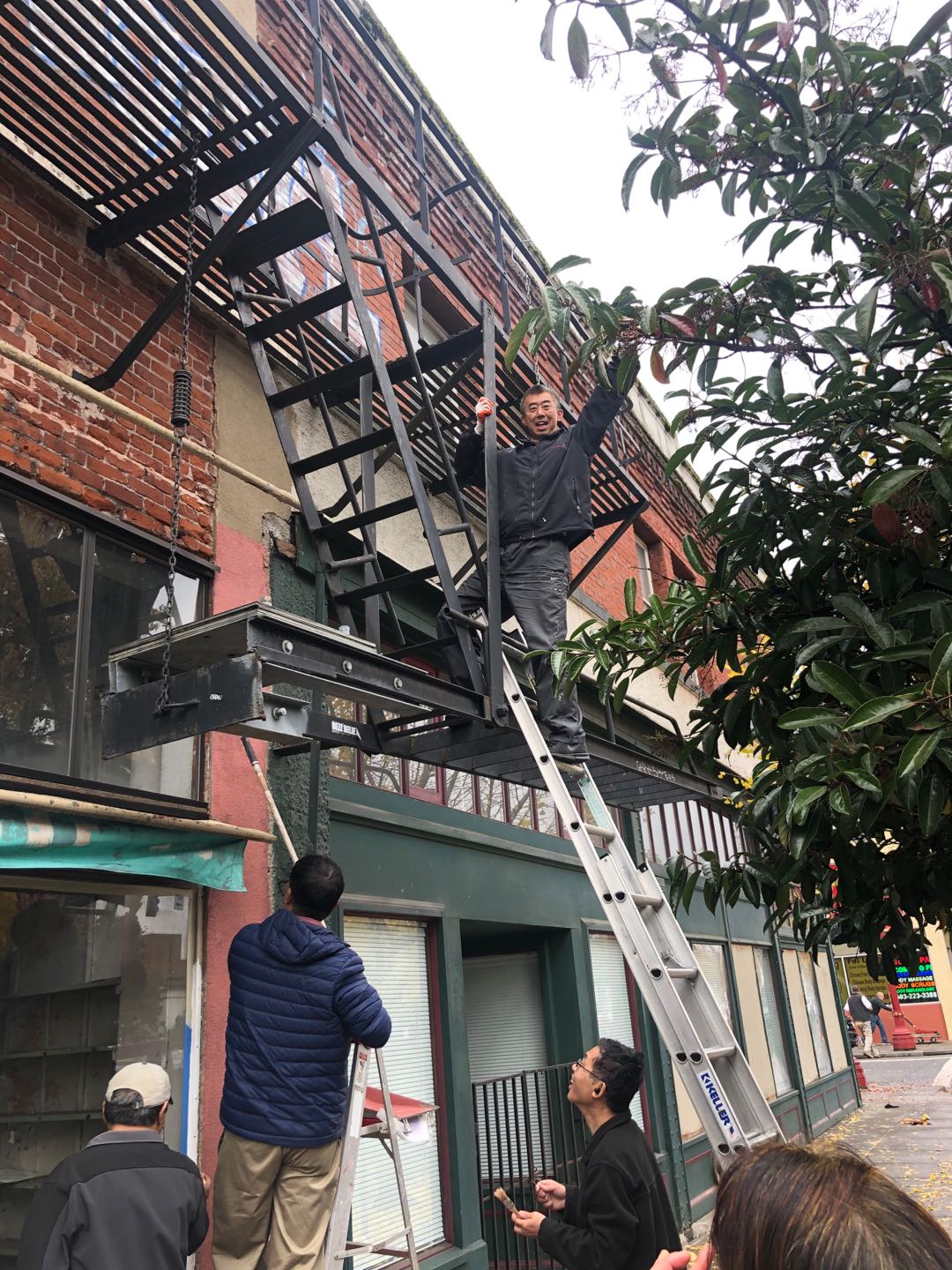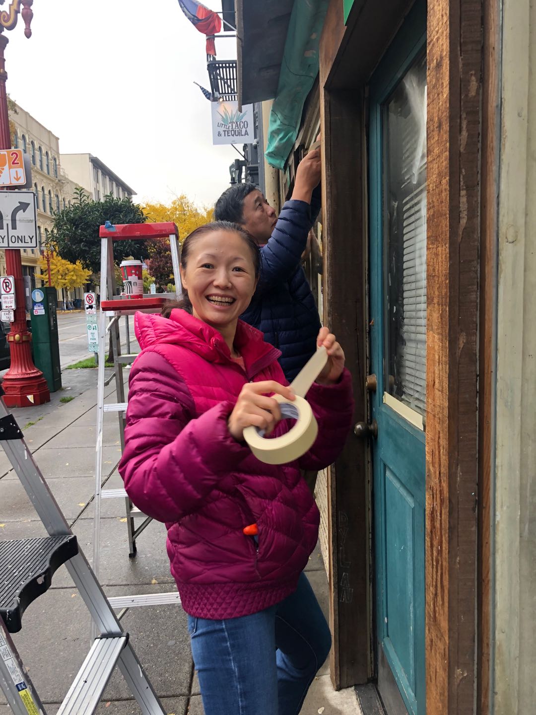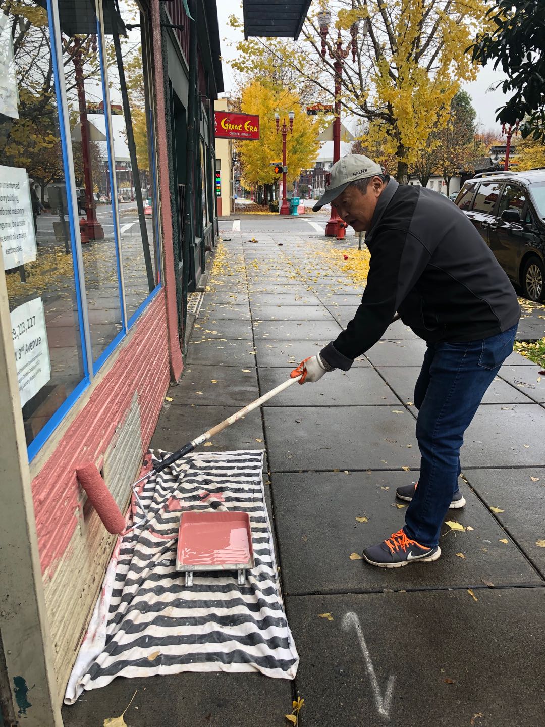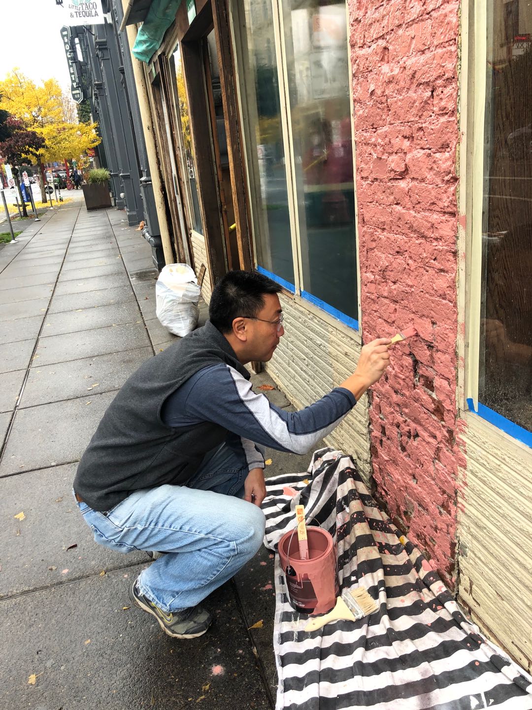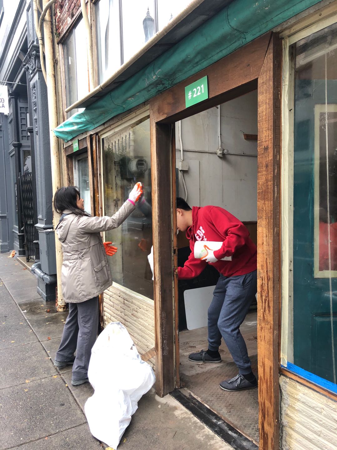 周日Wong Laundry building的股东和家属们到了中国城,前一个星期邻居业主帮做了powerwashing,这次大家过来粉刷外墙和清洗窗户。中国城不多见这样的一组人,各个知性十足,在公司和各自领域各领风骚。平时在家里估计也是很少干这种事的,尤其是我们的男同胞们,刷油漆也是平生第一次。为了帮助改变neighborhood的容貌,大家聚在了一起。几个小时过后,建筑外表发生了“巨变”,楼里面积攒了近半个世纪的尘埃也被打扫一空。下一步,我们会尽快做好posters,让街区的这一段变成吸引游客顿足的一景。
