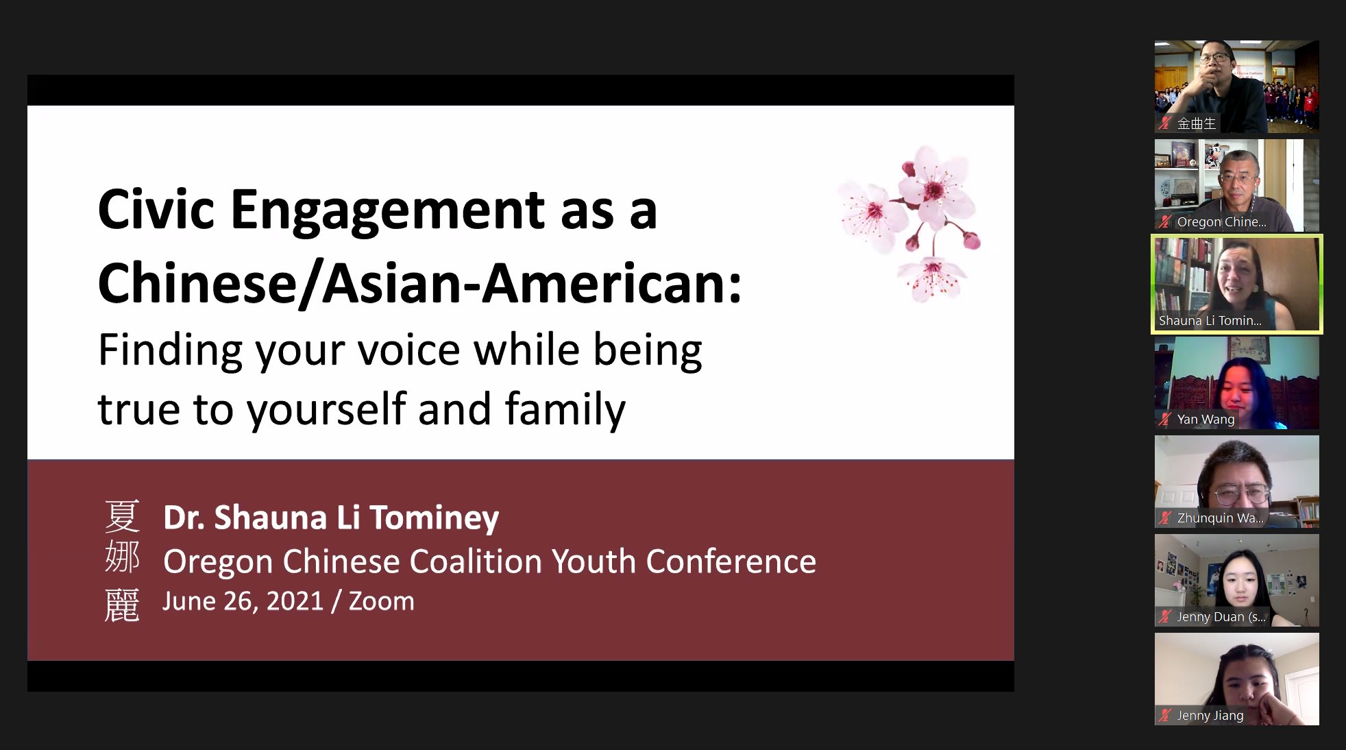 第二个话题则是鼓励青少年的社会参与,应对仇视亚裔情绪有很多事情可以做,通过主动参与改变周边生存环境会有一个更加长期持续的效果。 我们有幸邀请到OSU的Tominey博士和我们自己社区的Sophia Pi同学,Tominey博士分享了自己成长经历及对华人参政议政路径的思考,通过大量的图片和数据告诉我们的青少年什么是领导力和社会参与对个人成长的种种好处。 Sophia同学介绍了写信给Metro官员说服他们为华工纪念园拨款的亲身经历。她们的介绍让我们意识到参与是硬道理,如何参与也是值得我们去深度思考的一个问题。