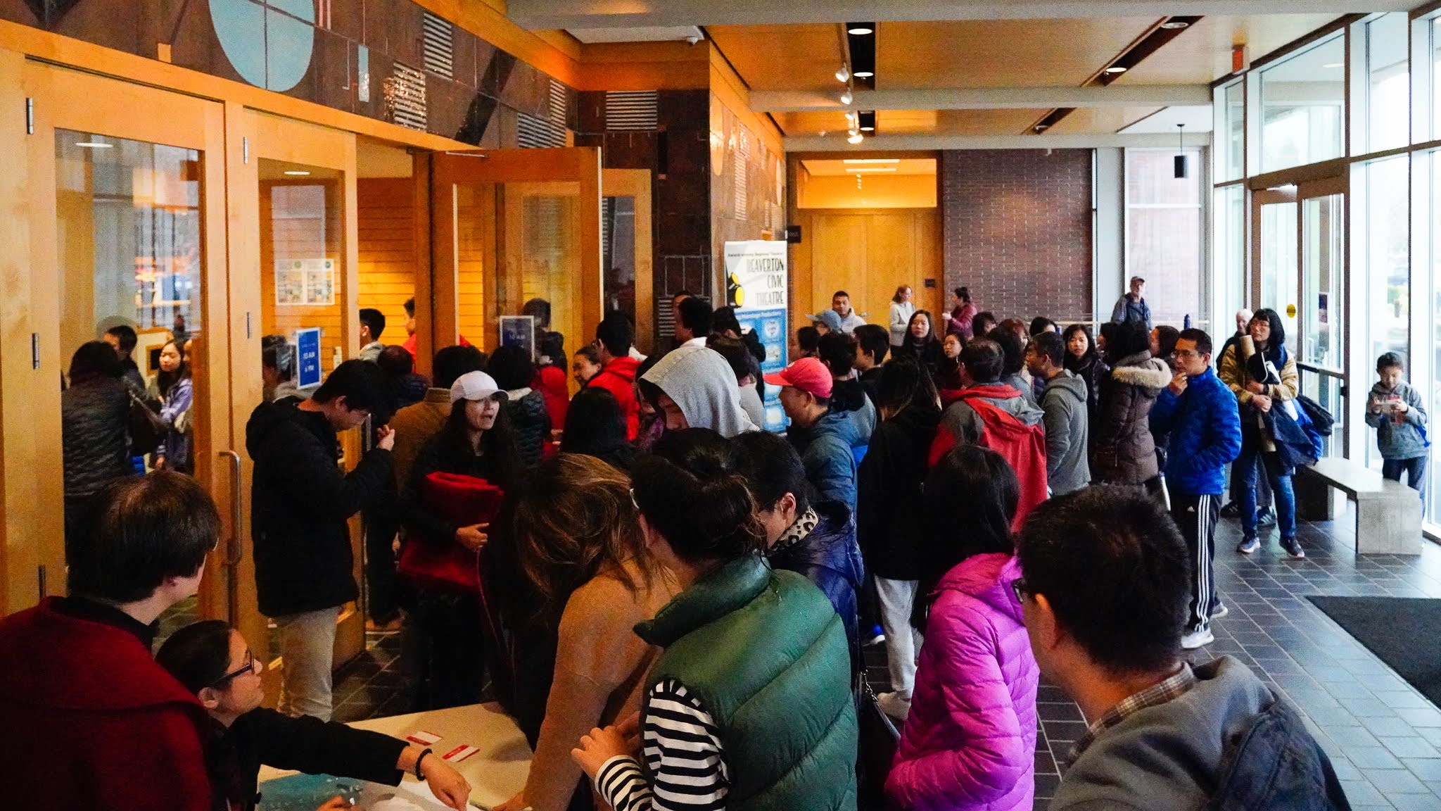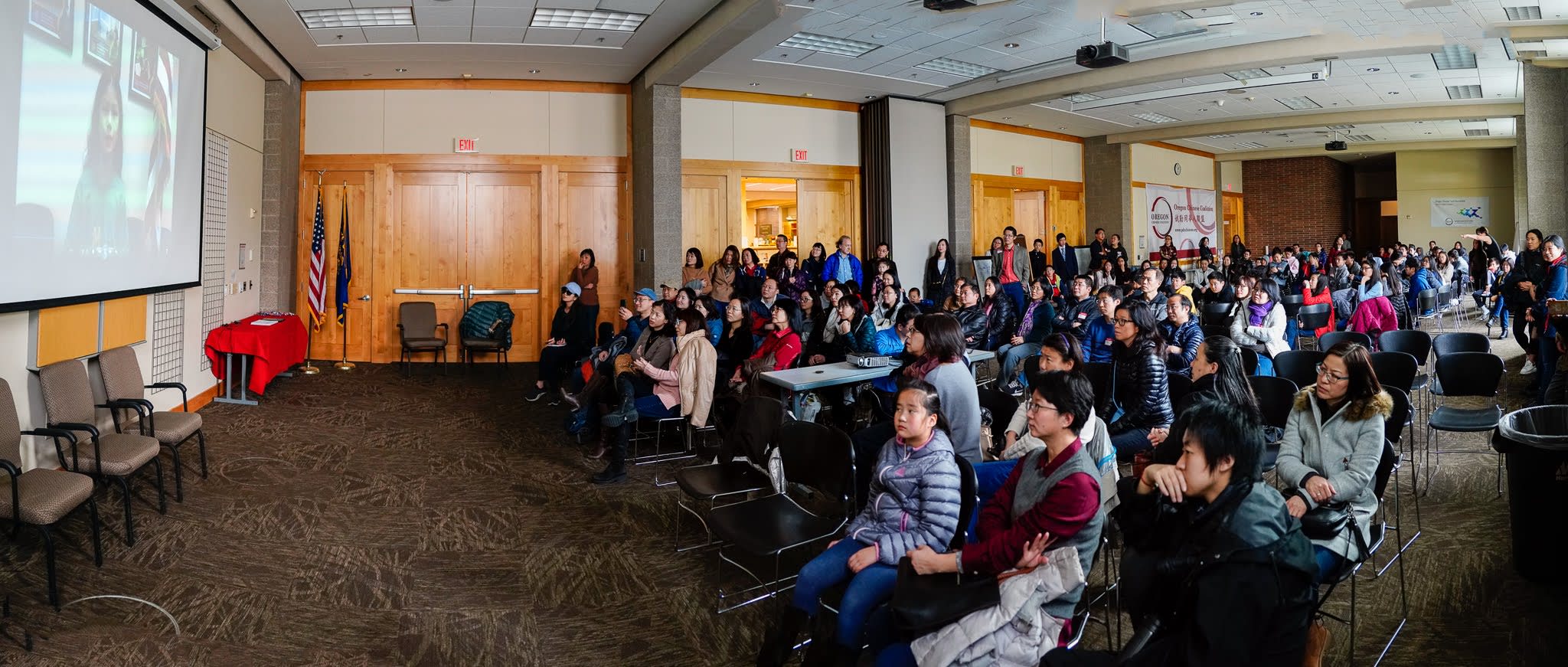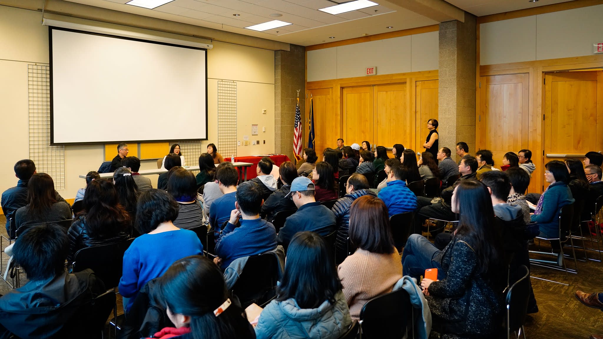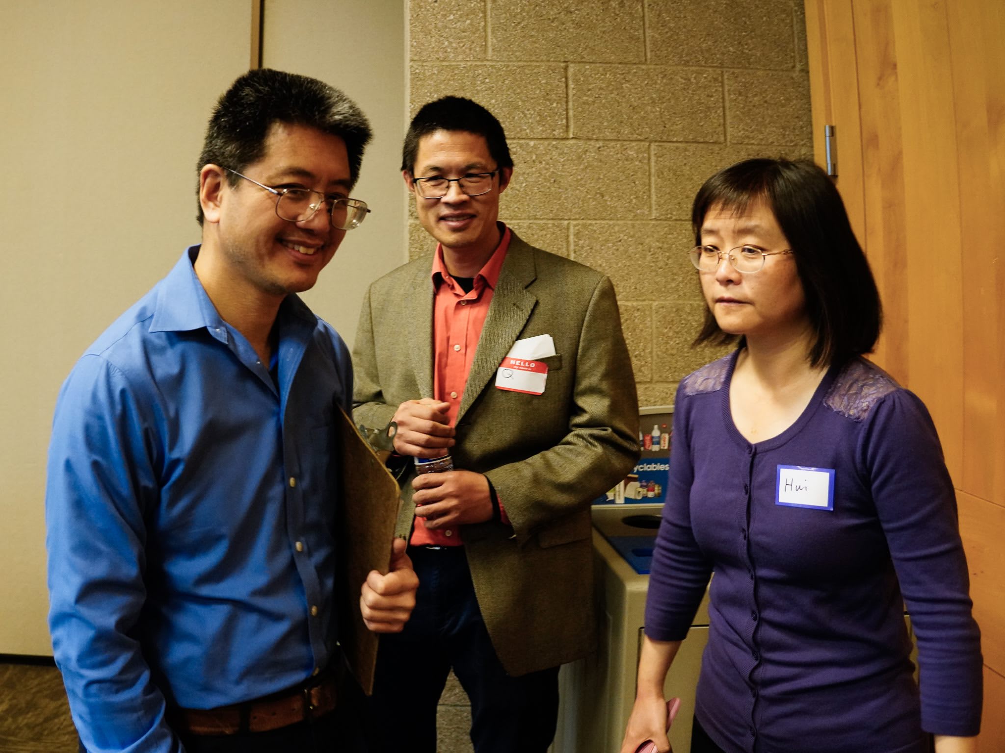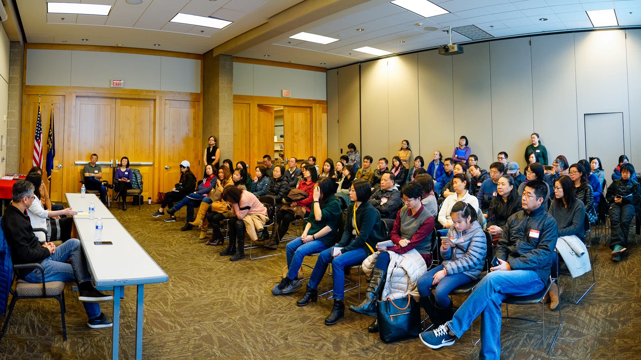 这是我们第一次在Beaverton City Library meeting rooms举办活动,应该是很抢手,当时就拿到了3个小时的slot,如果临时setup,可以利用的时间就会大打折扣了。恰巧前一天闭馆之前有一个半小时,老张(广超),老王(准勤),淼莲和我有可能把会场布置好,并熟悉了现场,包括操练两个会议室隔断的开和关。
