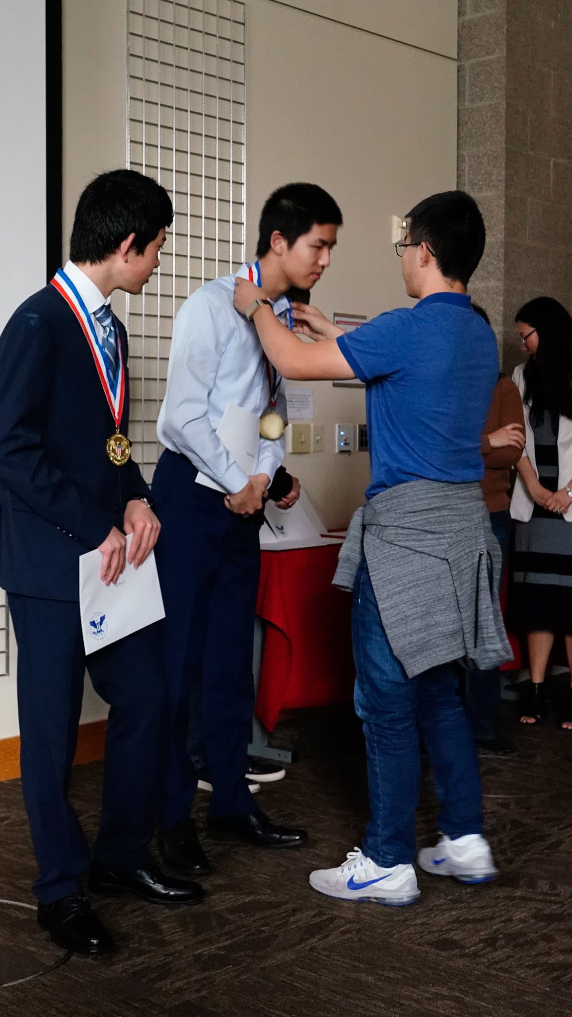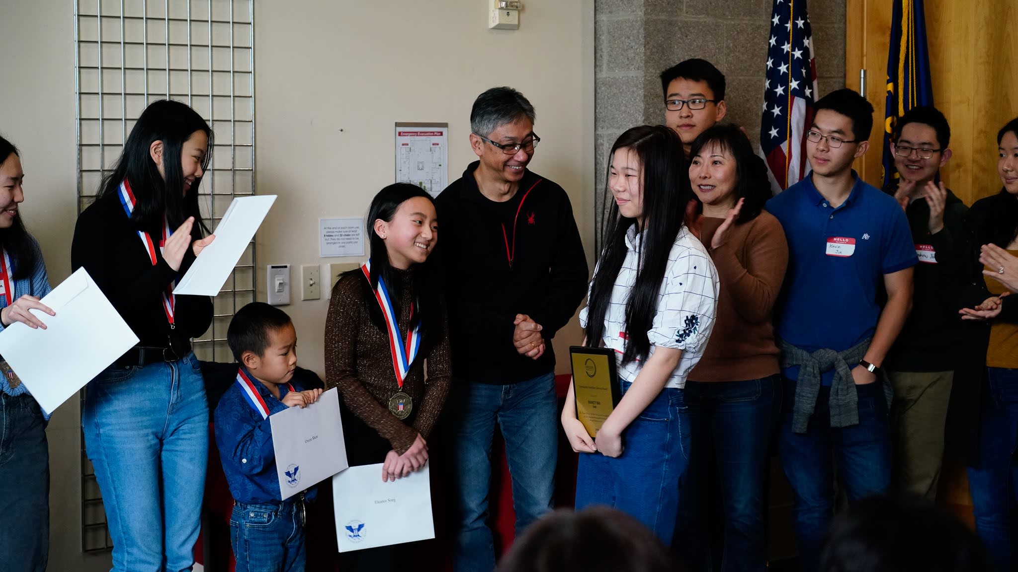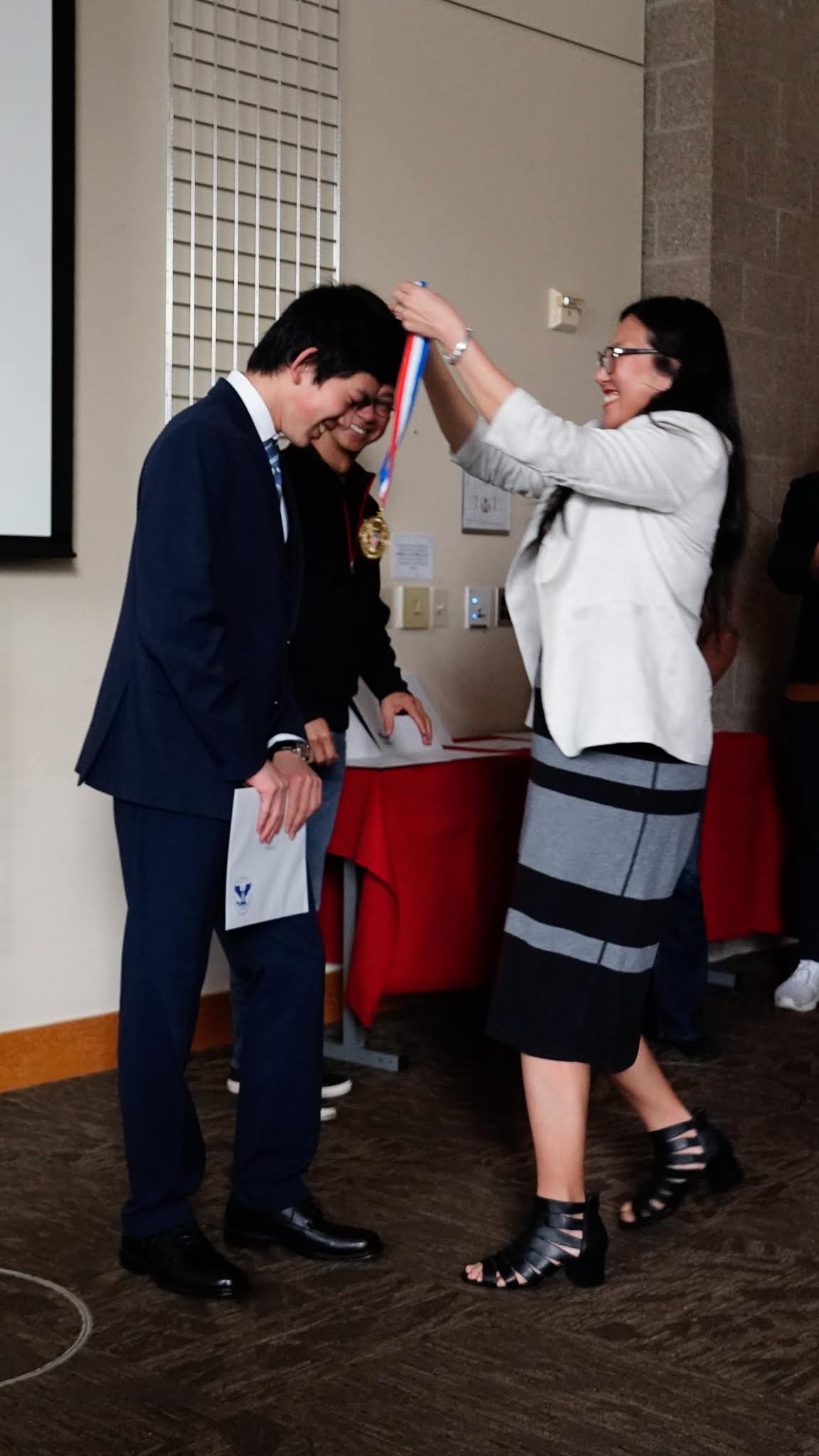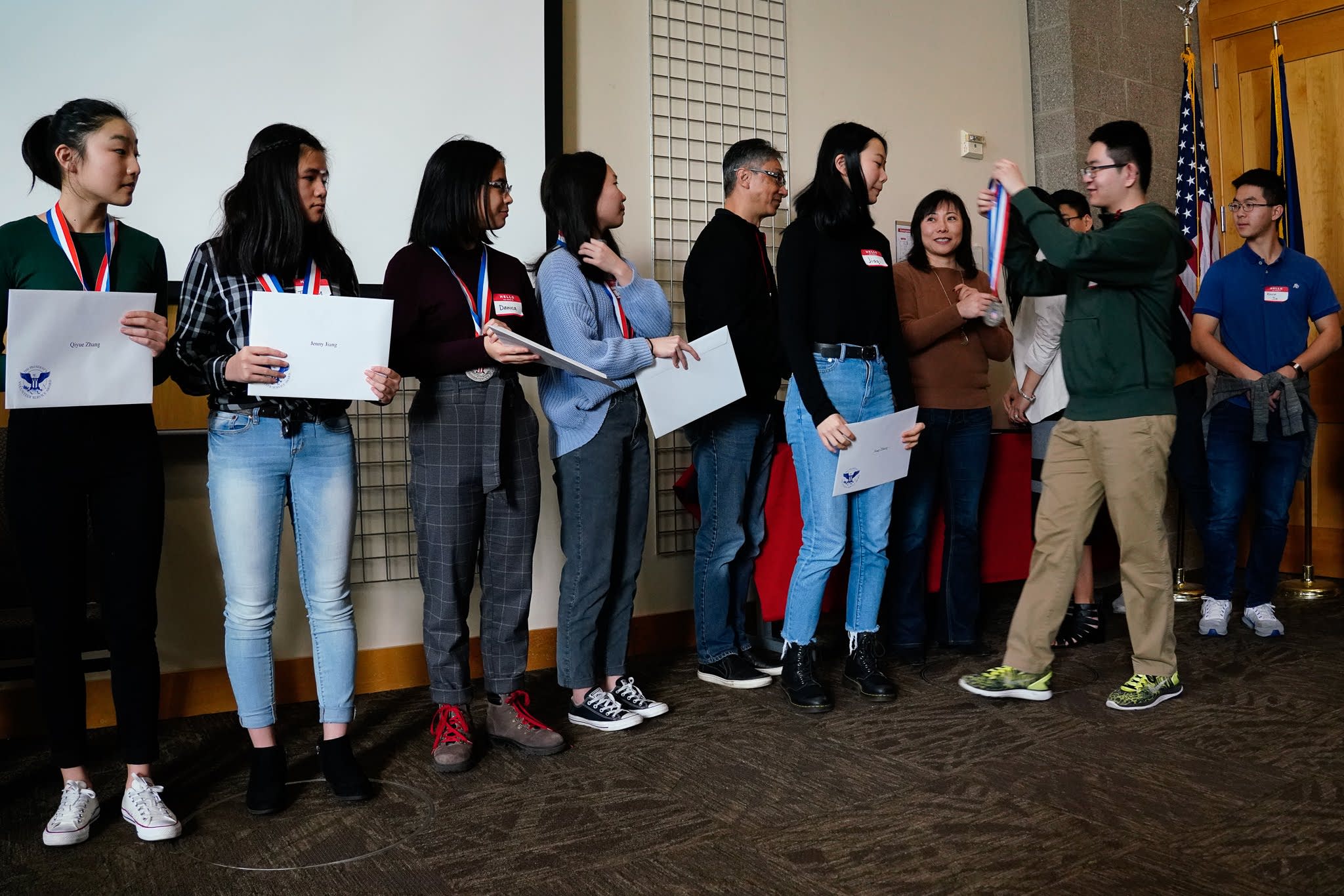 看完录像之后,我们邀请mentors和大学生毕业生们上前,在同学和家长们的见证下,给每一位获奖者颁发奖章和证书。